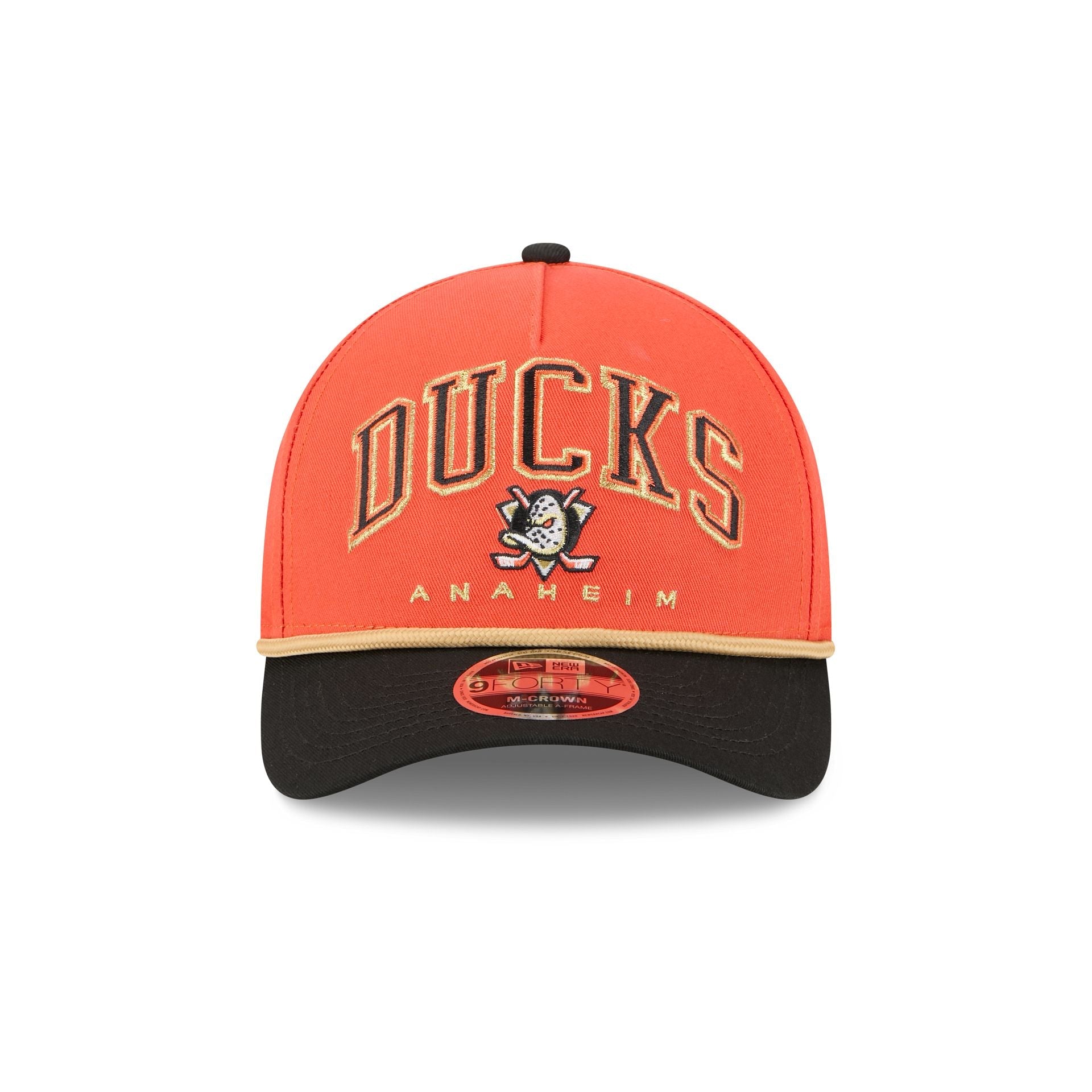 The Anaheim Ducks Arch 9FORTY M-Crown A-Frame Snapback features an embroidered Ducks graphic at the front panels with a rope at the visor. Additional details include an adjustable snapback closure at the rear with a gray undervisor.