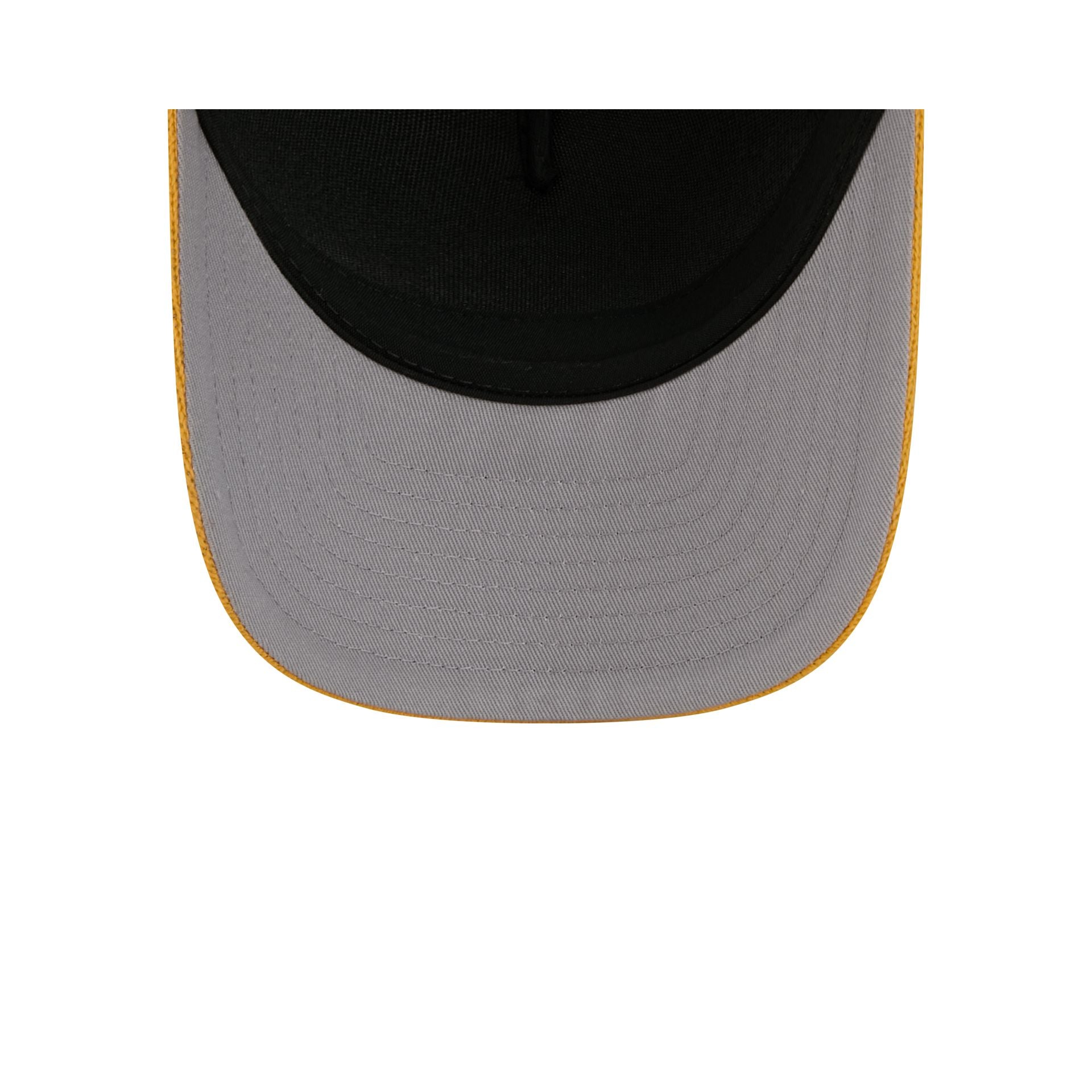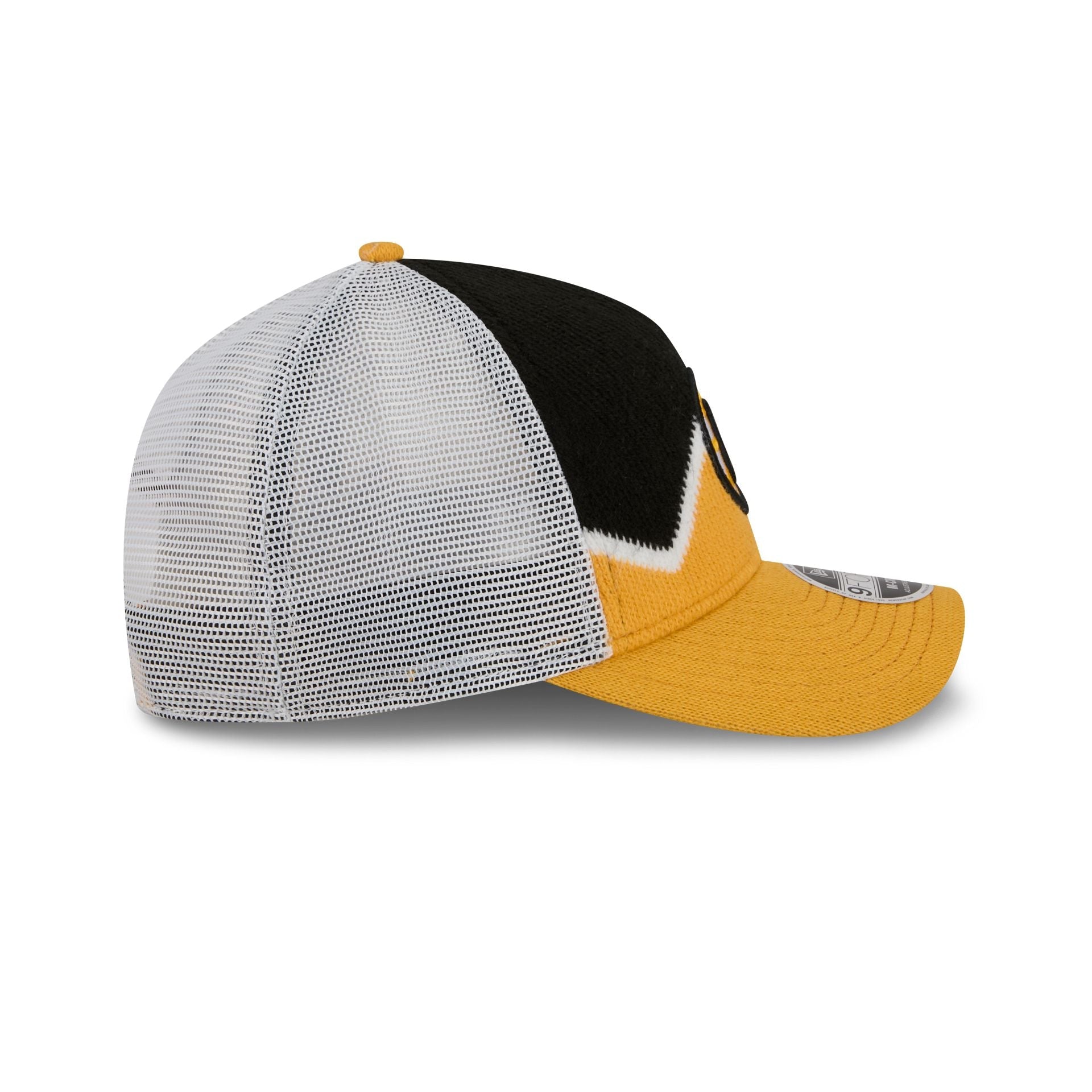 The Boston Bruins Sock 9FORTY M-Crown A-Frame Trucker features an embroidered Bruins logo at the front panels against a split sock fabrication. Additional details include a snapback closure at a mesh rear.