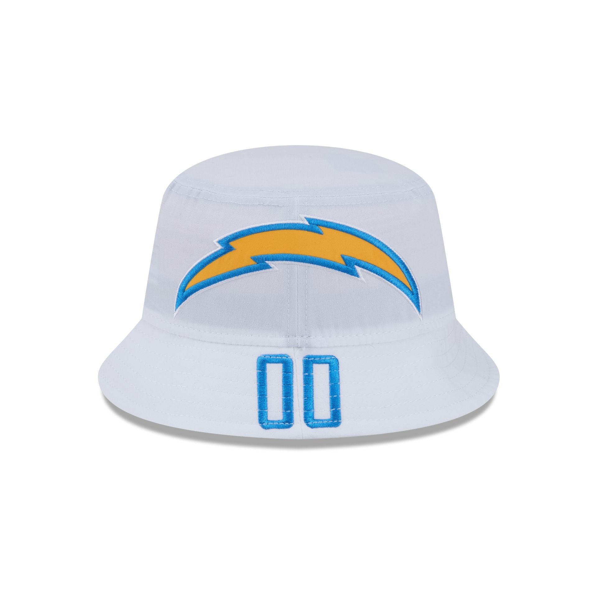 The Los Angeles Chargers Helmet Bucket Hat features an embroidered Chargers helmet design throughout.