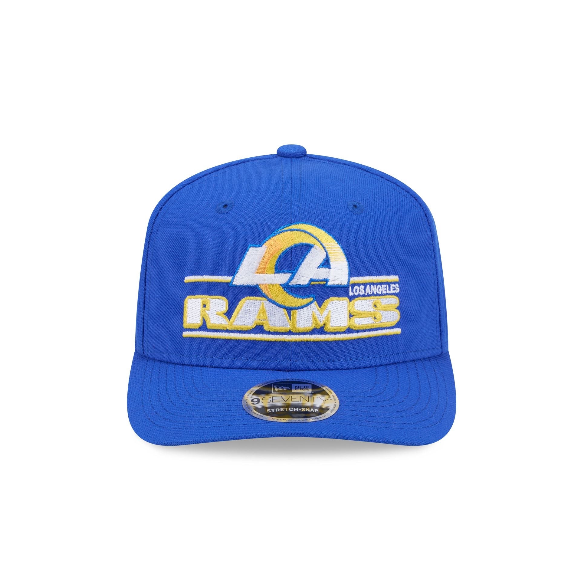 The Los Angeles Rams Stated 9SEVENTY Stretch-Snap features an embroidered Rams graphic a the front panels with an adjustable stretch-snap closure at the rear and a gray undervisor.