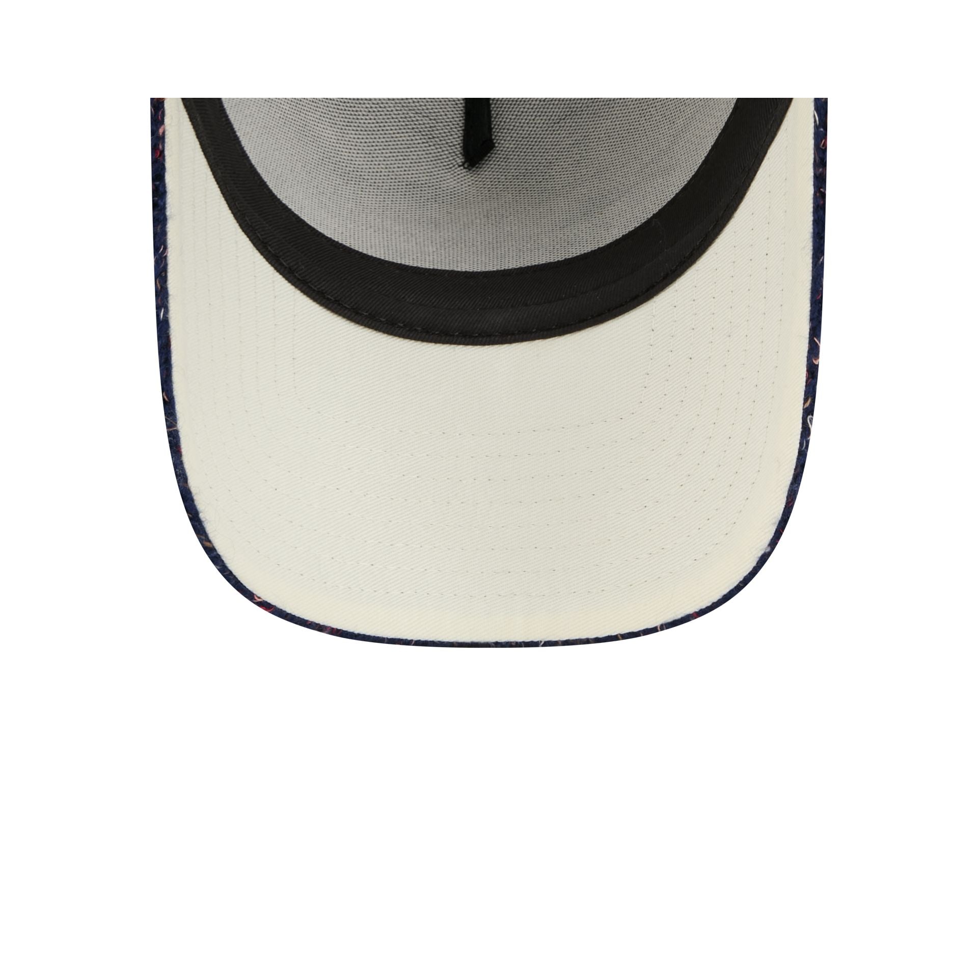 The San Jose Sharks Knit Women's 9FORTY A-Frame Trucker features an embroidered Sharks logo at the front knit panels. Additional details include a snapback closure at a mesh rear and white undervisor.