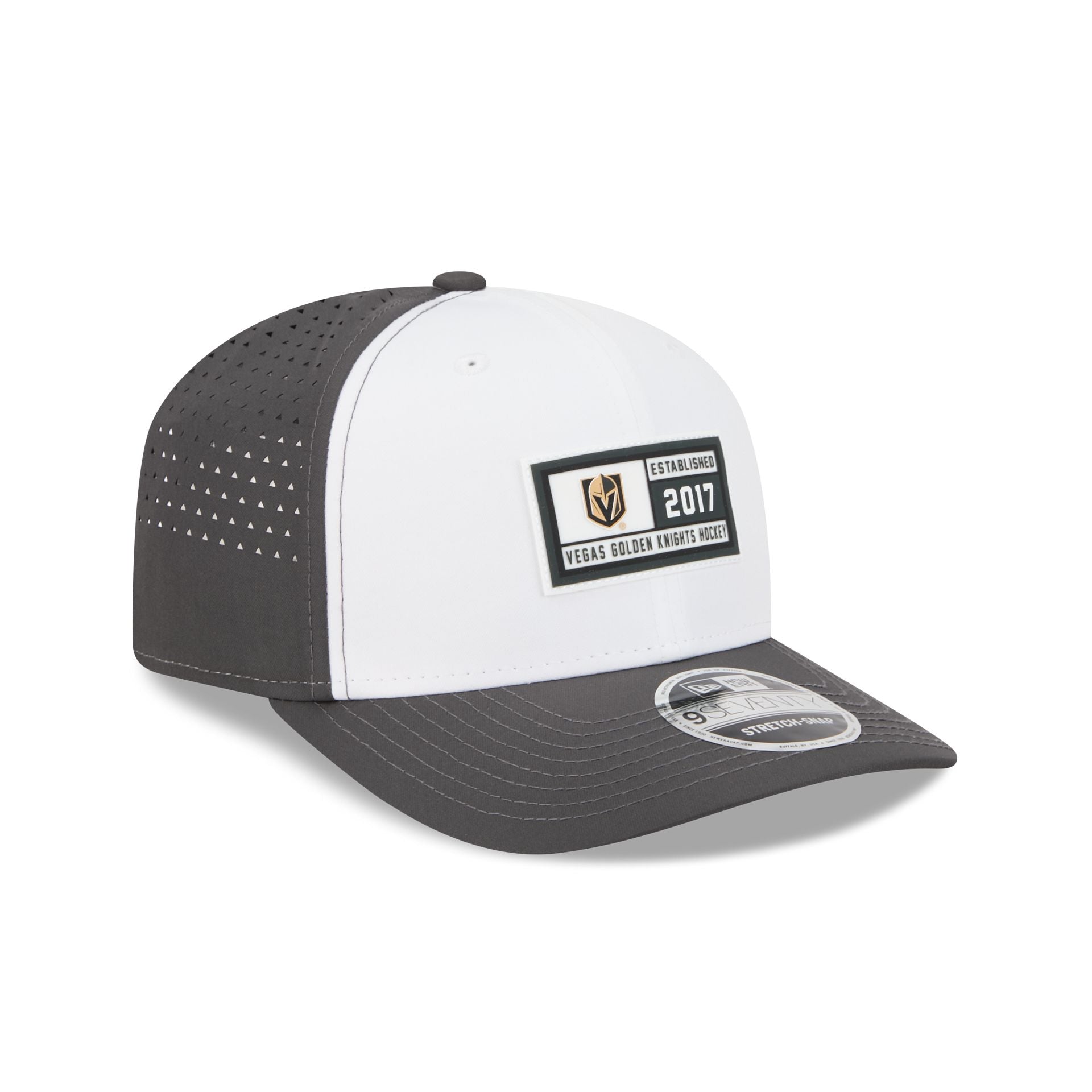 The Vegas Golden Knights Est. Patch 9SEVENTY Stretch-Snap features a woven silicone Golden Knights establishment patch at the front panels with a slant-snap closure at a performance mesh rear and a gray undervisor.