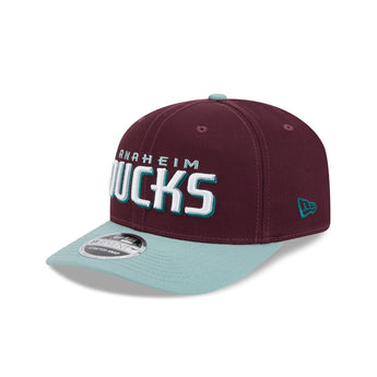 The Anaheim Ducks Maroon 9SEVENTY Stretch-Snap features an embroidered Ducks logo at the front panels with a snapback closure at the rear and a teal undervisor.