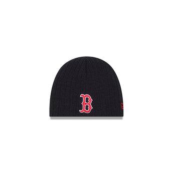 The Boston Red Sox Mini Fan Kids Skull Knit features an embroidered Red Sox logo at the front with a mini fan script at the rear and New Era Flag at the left-wear side