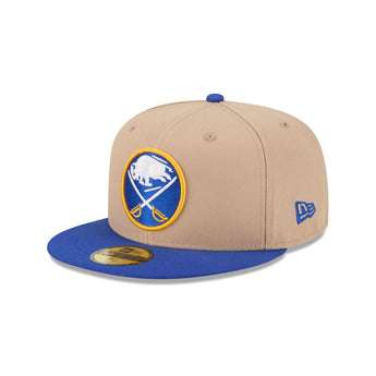 The Buffalo Sabres Camel 59FIFTY Fitted Cap features an embroidered Sabres logo at the front panels with a matching NHL Shield at the rear, a team color visor, and a gray undervisor.
