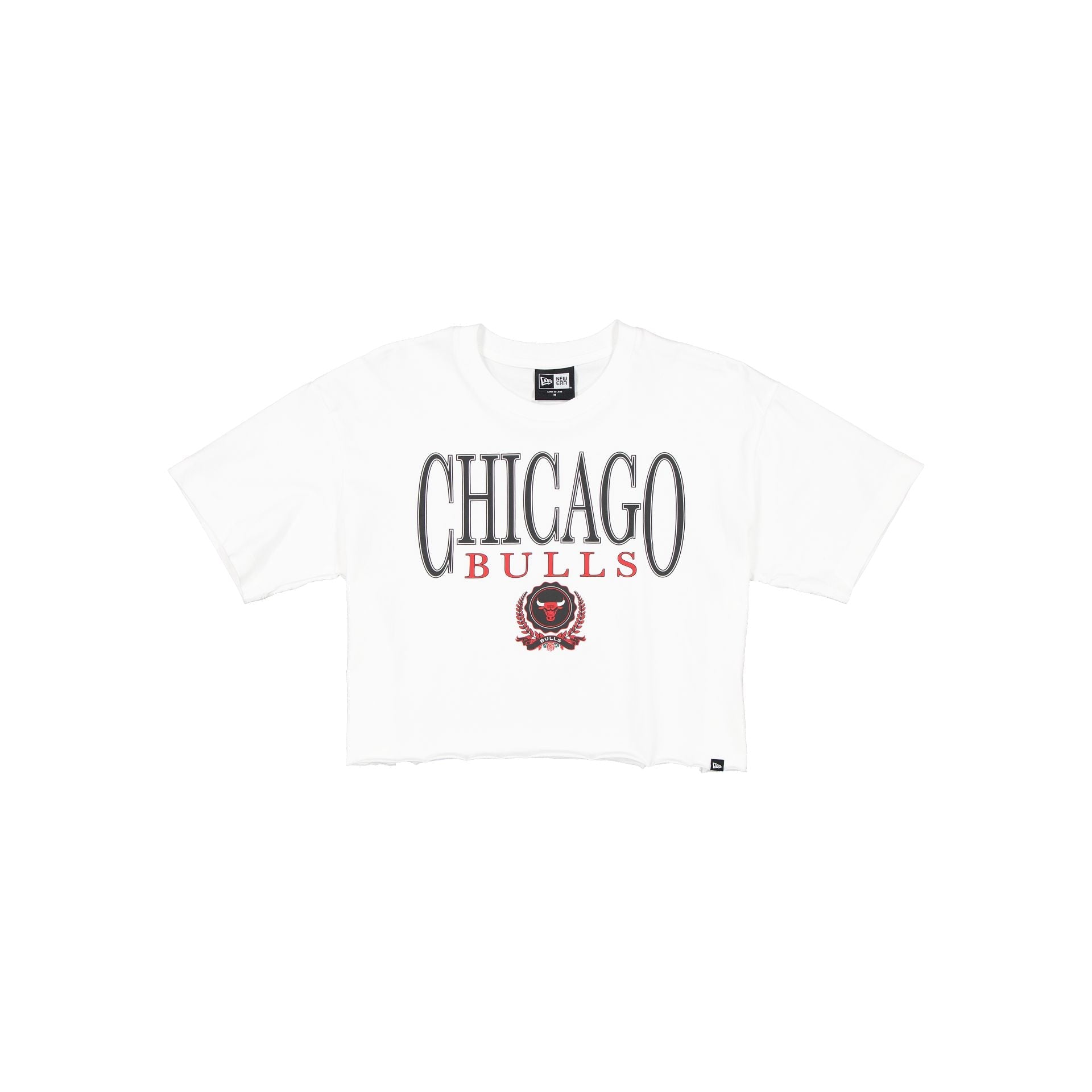 The Chicago Bulls Throwback Prep Women's Cropped T-Shirt features a screen-printed Bulls wordmark above a team emblem at the front.