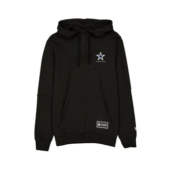 The Dallas Cowboys 2025 Functional Fandom Black Hoodie features an embroidered silicone Cowboys logo at the left chest with kangaroo pockets and an Official NFL Combine Authentic patch at the left hip. Additional details include a clear gel ink New Era logo at the rear right shoulder with a screen-printed establishment date at an adjustable drawstring hood. This hoodie features water resistant fabric throughout.