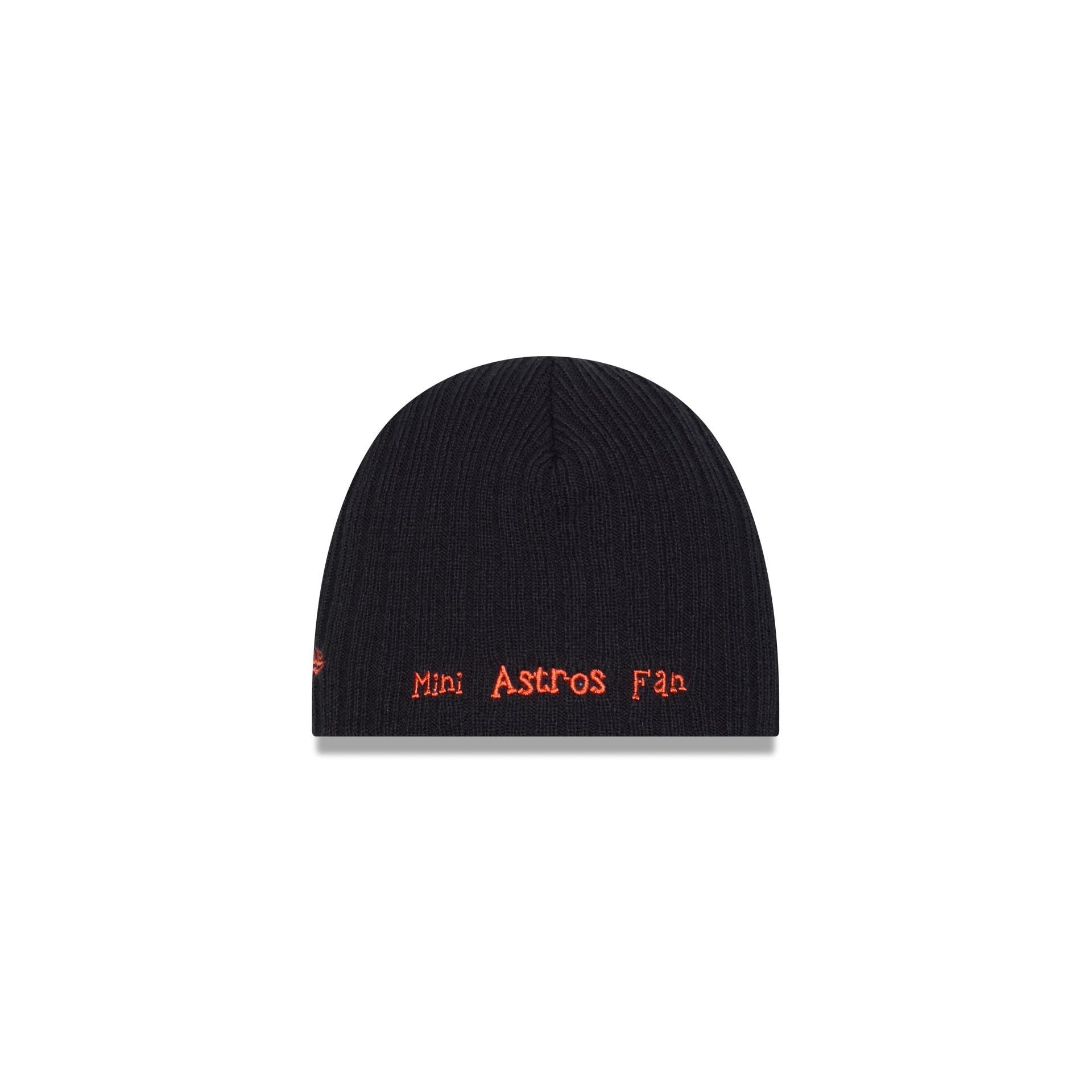 The Houston Astros Mini Fan Kids Skull Knit features an embroidered Astros logo at the front with a mini fan script at the rear and New Era Flag at the left-wear side