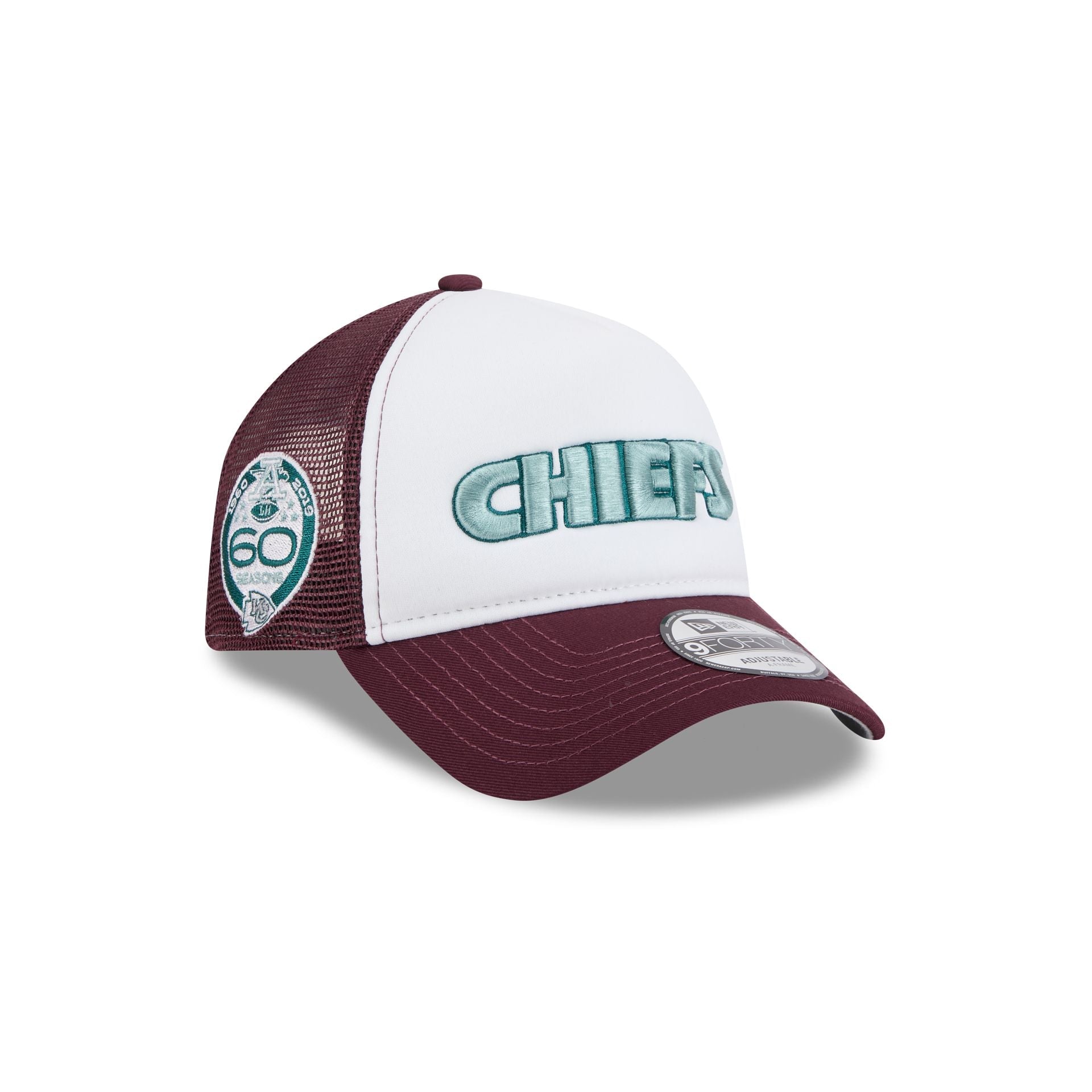 The Kansas City Chiefs Optic White 9FORTY A-Frame Snapback features an embroidered Chiefs logo at the front panels with a 60th Anniversary patch at the right-wear side. Additional details include a snapback closure at a mesh rear and a gray undervisor.