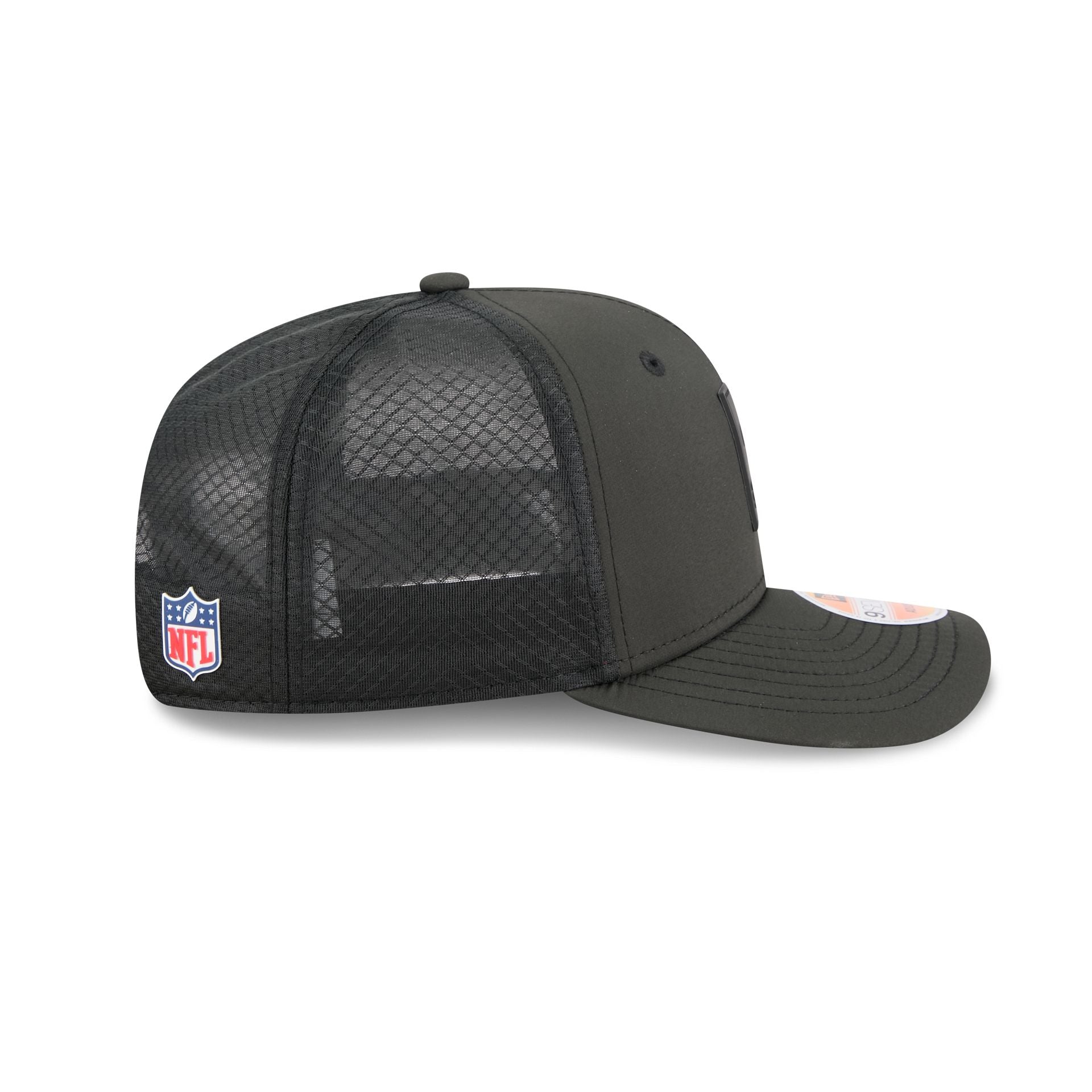 The New Orleans Saints 2025 Sideline Hot Weather 9SEVENTY Trucker features a sewn-down silicone Saints logo patch at the front panels with a water-repellent quill tech fabrication throughout and a quick-dry cushioned sweatband to absorb moisture. Additional details include the Official NFL Shield logo to the right of a soft silicone snapback closure at a light-weight mesh rear. The undervisor is accented with a silicone transfer in the team’s colors.
