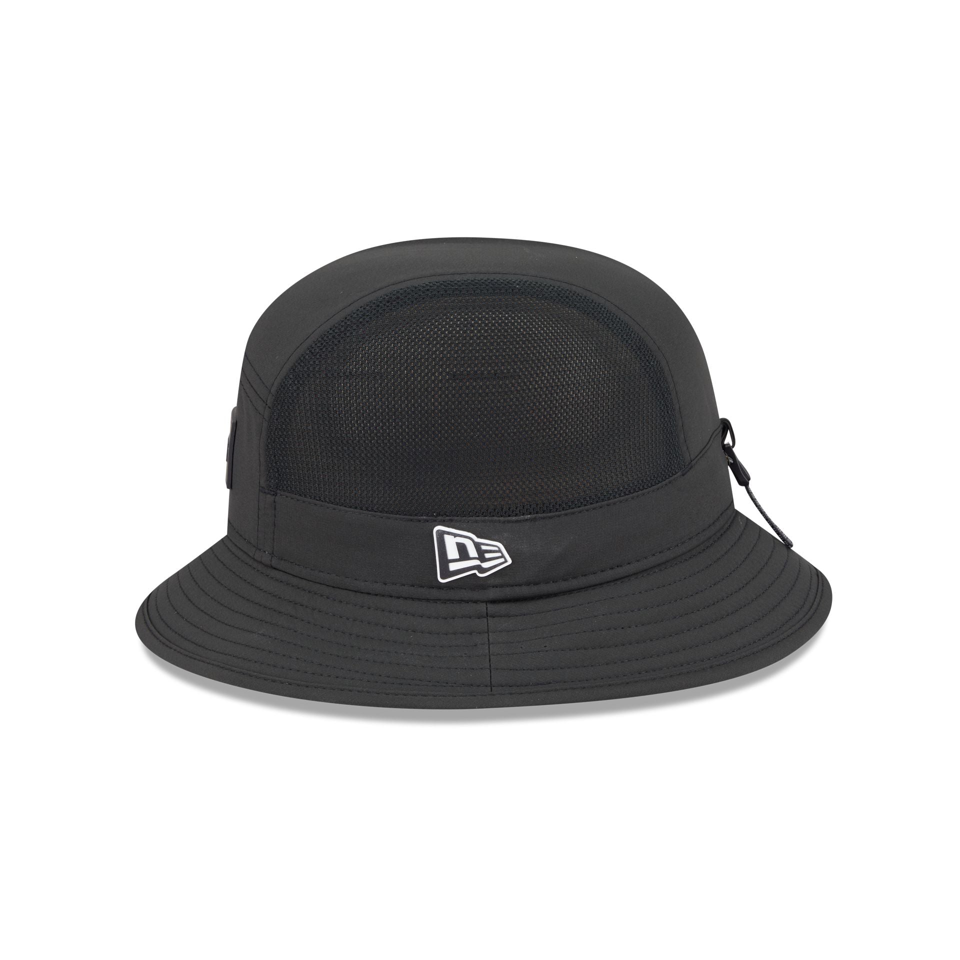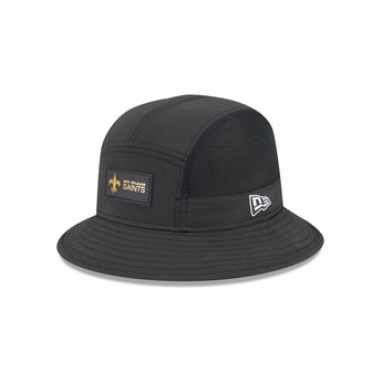 The New Orleans Saints 2025 Sideline Hot Weather Bucket Hat features a sewn-down silicone Saints logo patch at the front with the Official NFL Shield logo at the right-wear side. Additional details include breathable mesh side panels and an adjustable reflective drawstring at the rear.
