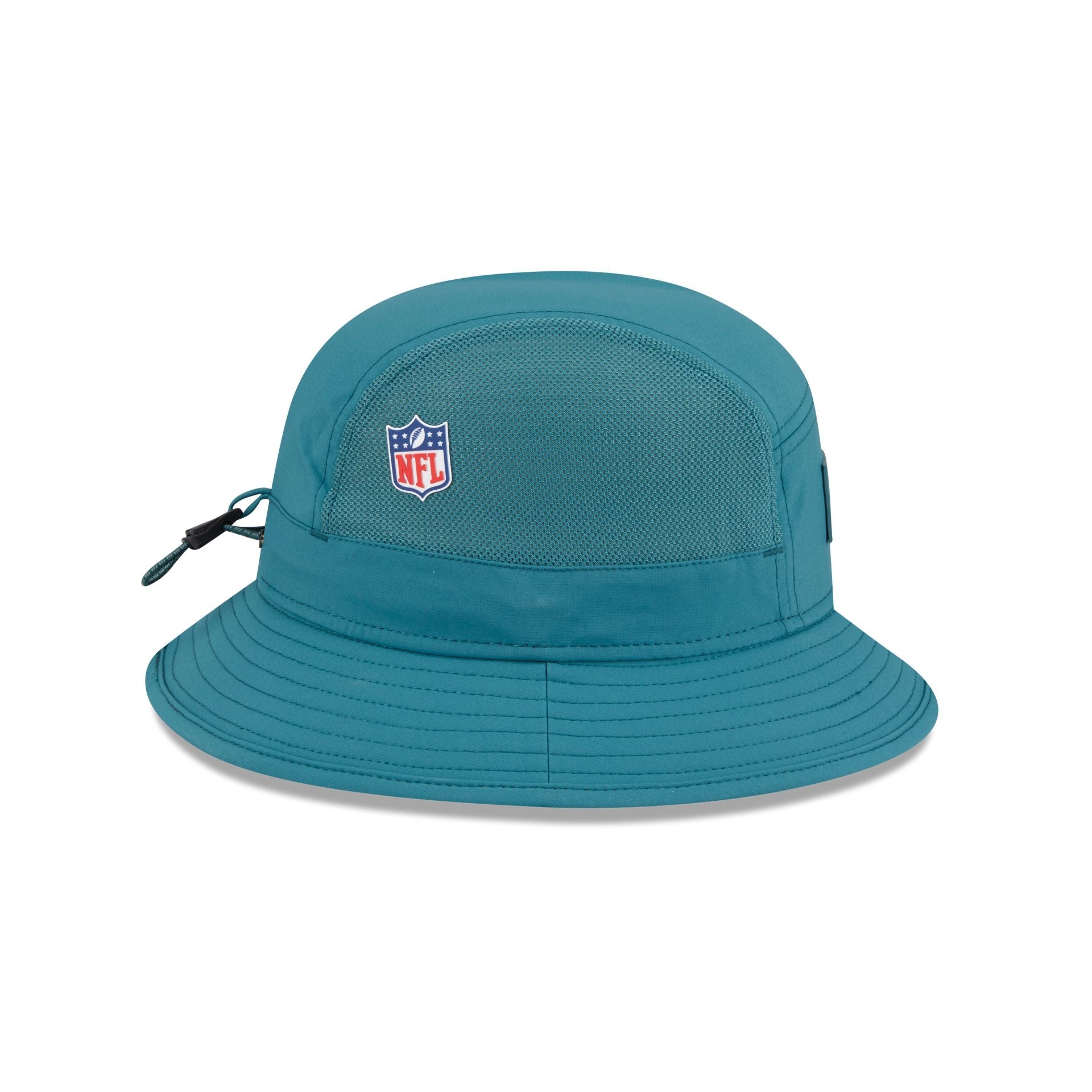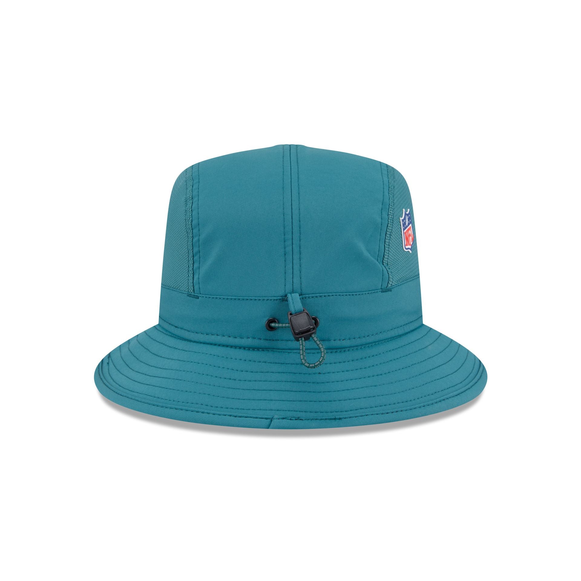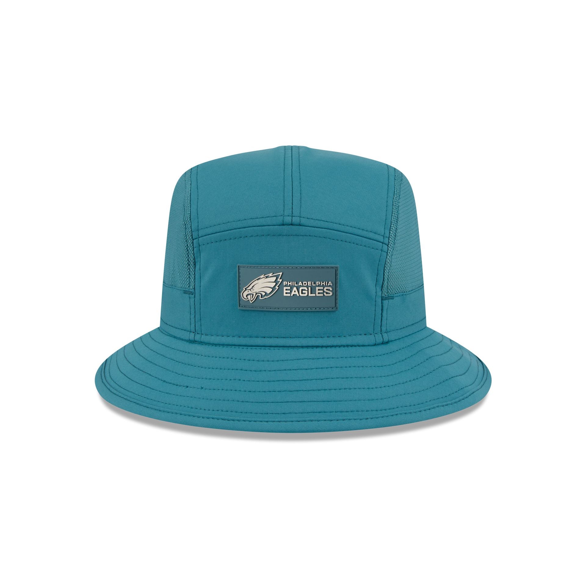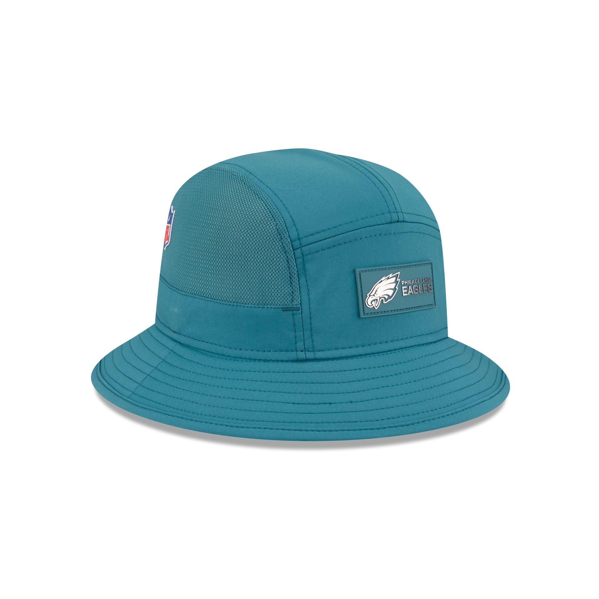 The Philadelphia Eagles 2025 Sideline Hot Weather Bucket Hat features a sewn-down silicone Eagles logo patch at the front with the Official NFL Shield logo at the right-wear side. Additional details include breathable mesh side panels and an adjustable reflective drawstring at the rear.