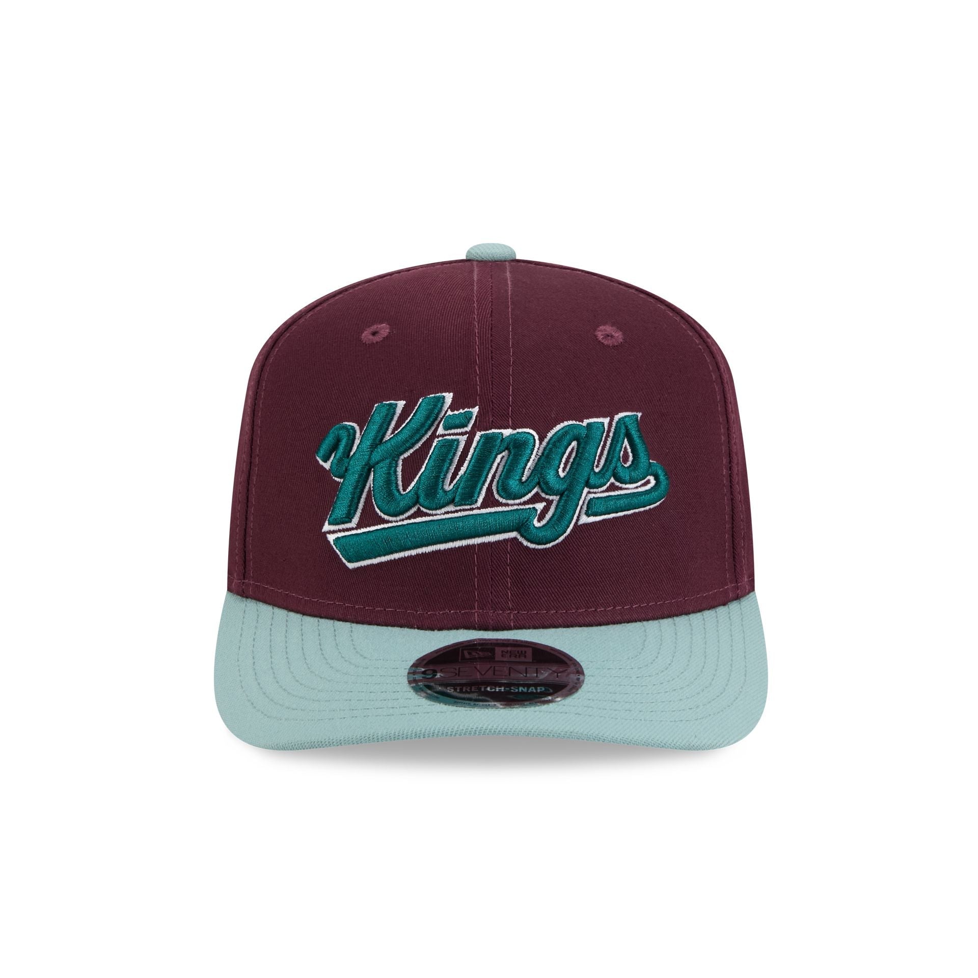 The Sacramento Kings Maroon 9SEVENTY Stretch-Snap features an embroidered Kings logo at the front panels with a snapback closure at the rear and a teal undervisor.