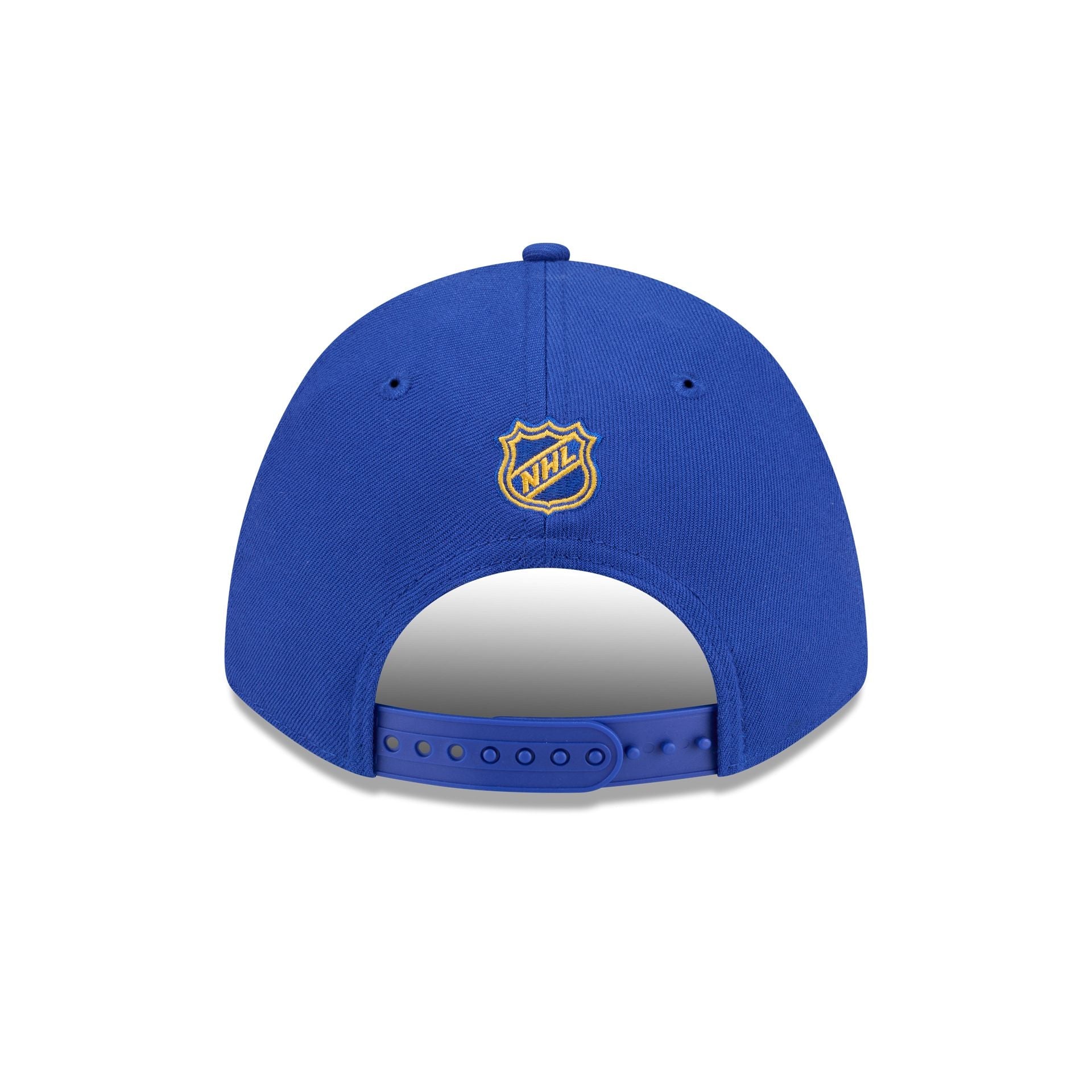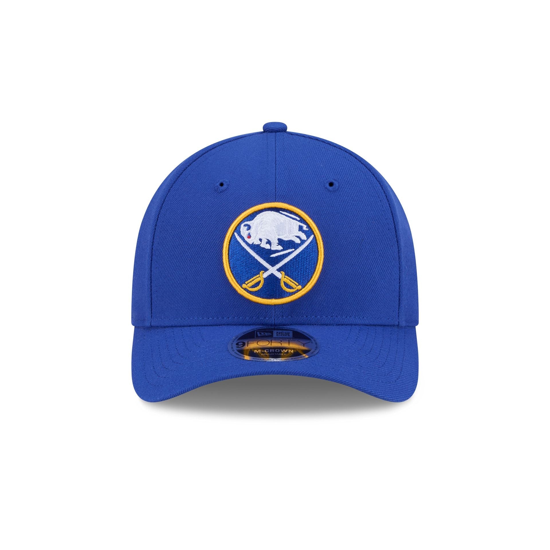 The Buffalo Sabres Team 9FORTY M-Crown Snapback features an embroidered Sabres logo at the front panels with the NHL Shield logo above an adjustable snapback closure at the rear and a gray undervisor.