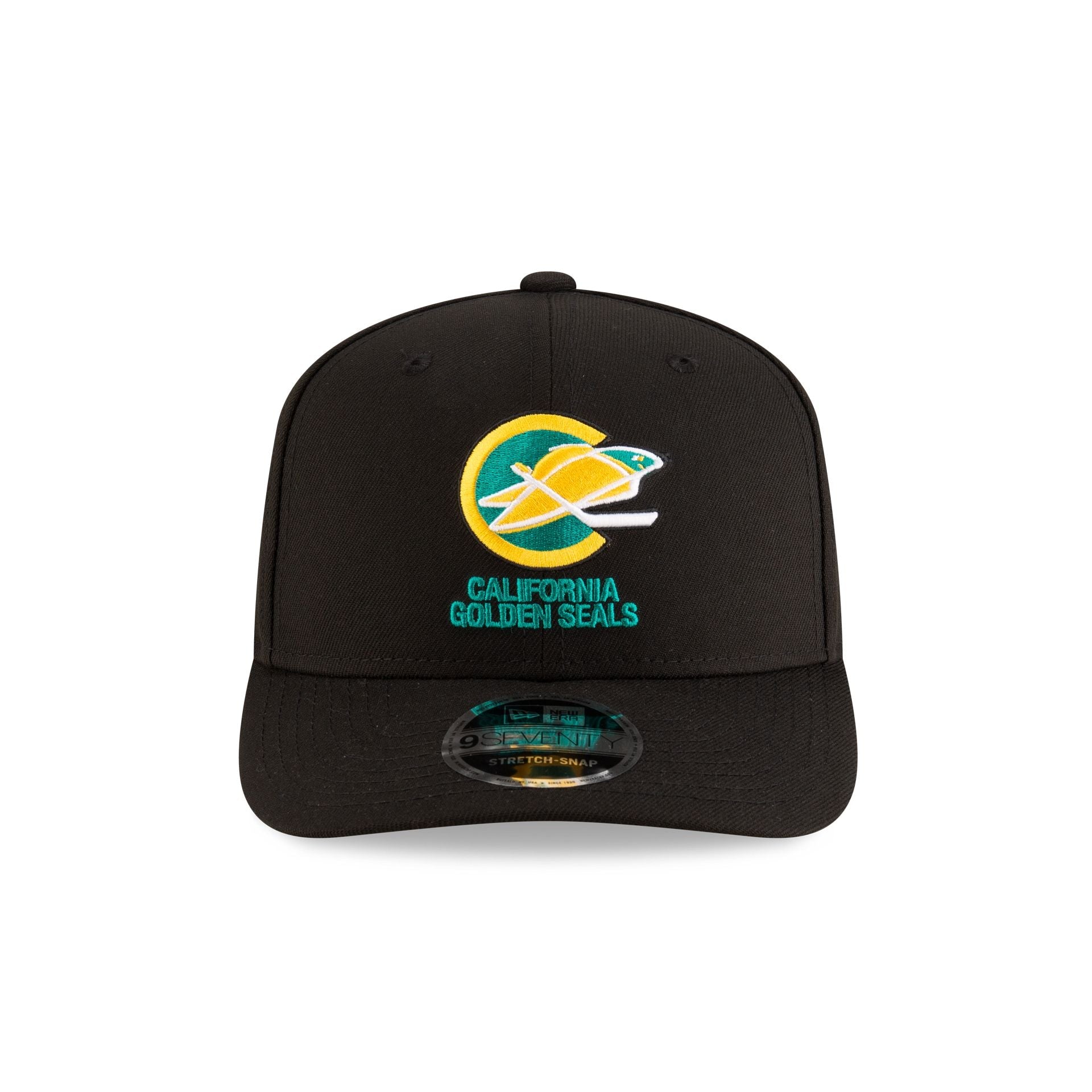 The California Golden Seals Team 9SEVENTY Stretch-Snap Cap features an embroidered Seals logo at the front panels with the NHL Shield logo above an adjustable stretch-snap closure at the rear and a gray undervisor.
