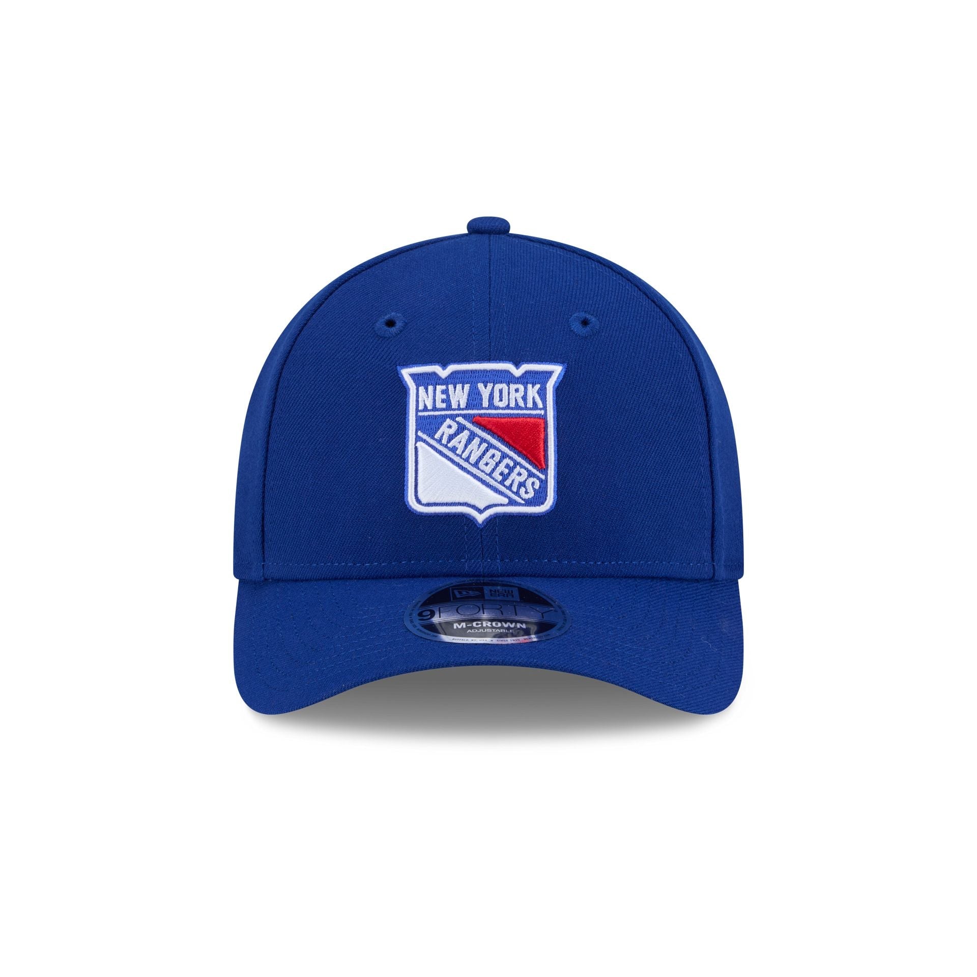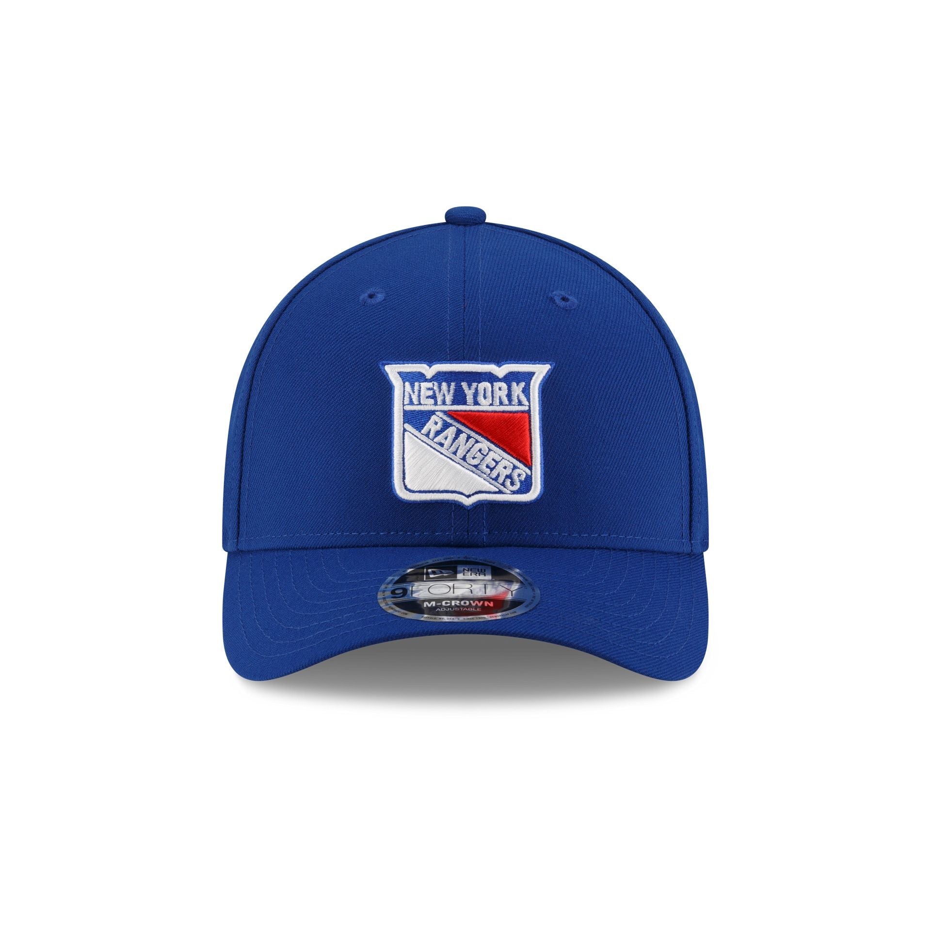 The New York Rangers Team 9FORTY M-Crown Snapback features an embroidered Rangers logo at the front panels with the NHL Shield logo above an adjustable snapback closure at the rear and a gray undervisor.