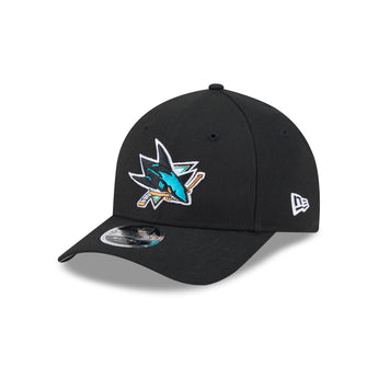 The San Jose Sharks Team 9FORTY M-Crown Snapback features an embroidered Sharks logo at the front panels with the NHL Shield logo above an adjustable snapback closure at the rear and a gray undervisor.