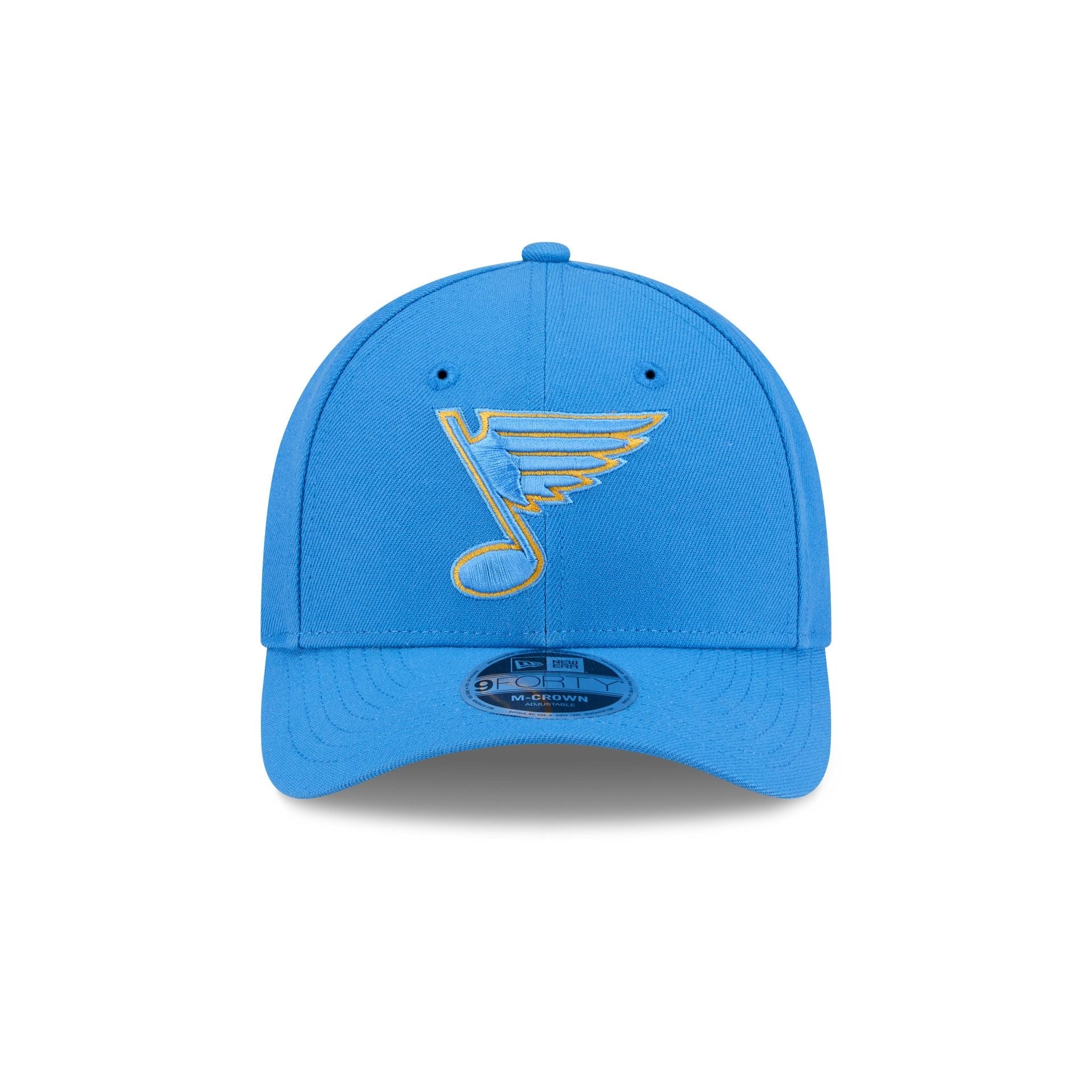 The St. Louis Blues Team 9FORTY M-Crown Snapback features an embroidered Blues logo at the front panels with the NHL Shield logo above an adjustable snapback closure at the rear and a gray undervisor.