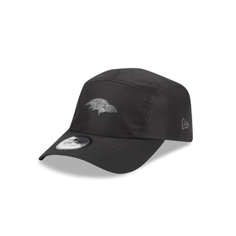 The Alpha Industries x Baltimore Ravens Black Runner Adjustable Cap features a silicone Ravens logo at the front with a woven New Era Cap x Alpha Industries tag above an adjustable Alpha Industries red ribbon strapback closure at the rear.