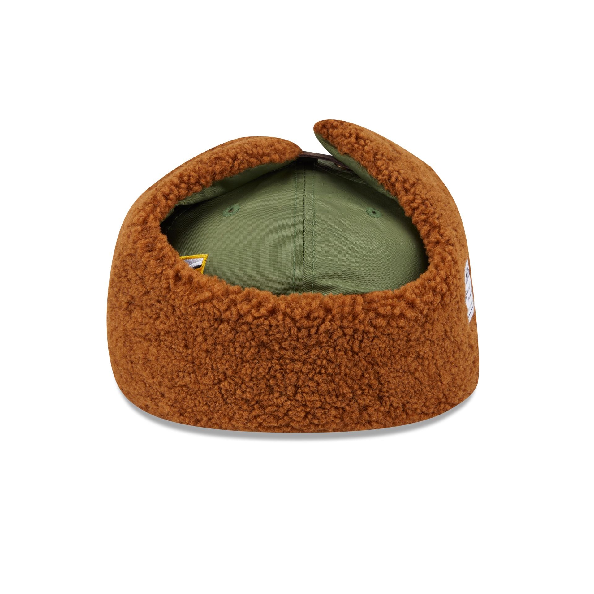 The Alpha Industries x Los Angeles Lakers Olive Green Dog Ear 59FIFTY Fitted Cap features a monochromatic embroidered Lakers logo at the front panels with a team state patch and a Western Conference logo at the left and right side of an NBA Logoman at the rear. Additional details include a signature Alpha Industries red ribbon and airplane patch at the left-wear side with a team patch at the right-wear side. The exterior ear cover details include a 17x NBA Champions patch with alternate team logos and a woven New Era Cap x Alpha Industries tag at the interior fleece lining with a snap button closure.