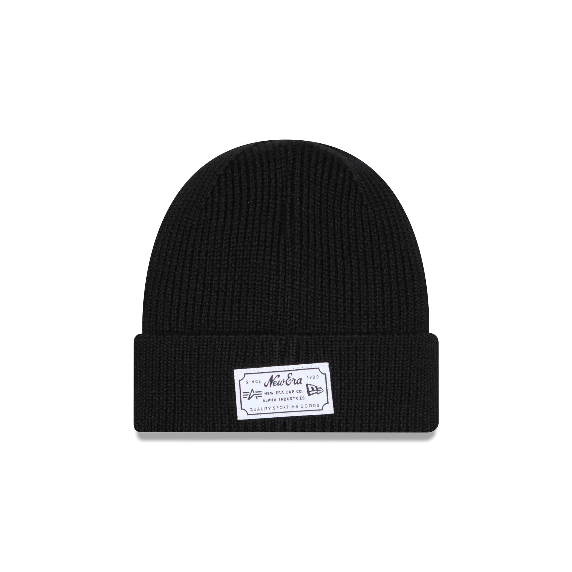 The Alpha Industries x New York Rangers Black Cuff Knit features an embroidered black and white Rangers logo at the front with the signature Alpha Industries red ribbon at the crown and a woven New Era Cap x Alpha Industries tag at the rear.