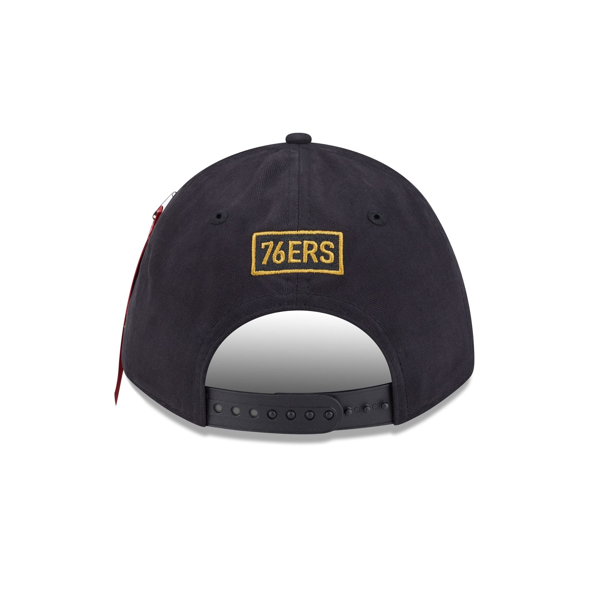 The Alpha Industries x Philadelphia 76ers Black 9FORTY M-Crown A-Frame Snapback features a gold embroidered 76ers logo at the front with a matching team wordmark above a snapback closure at the rear. Additional details include the signature Alpha Industries red ribbon at the left-wear side with embroidered gold leaf details at the visor and a black undervisor.
