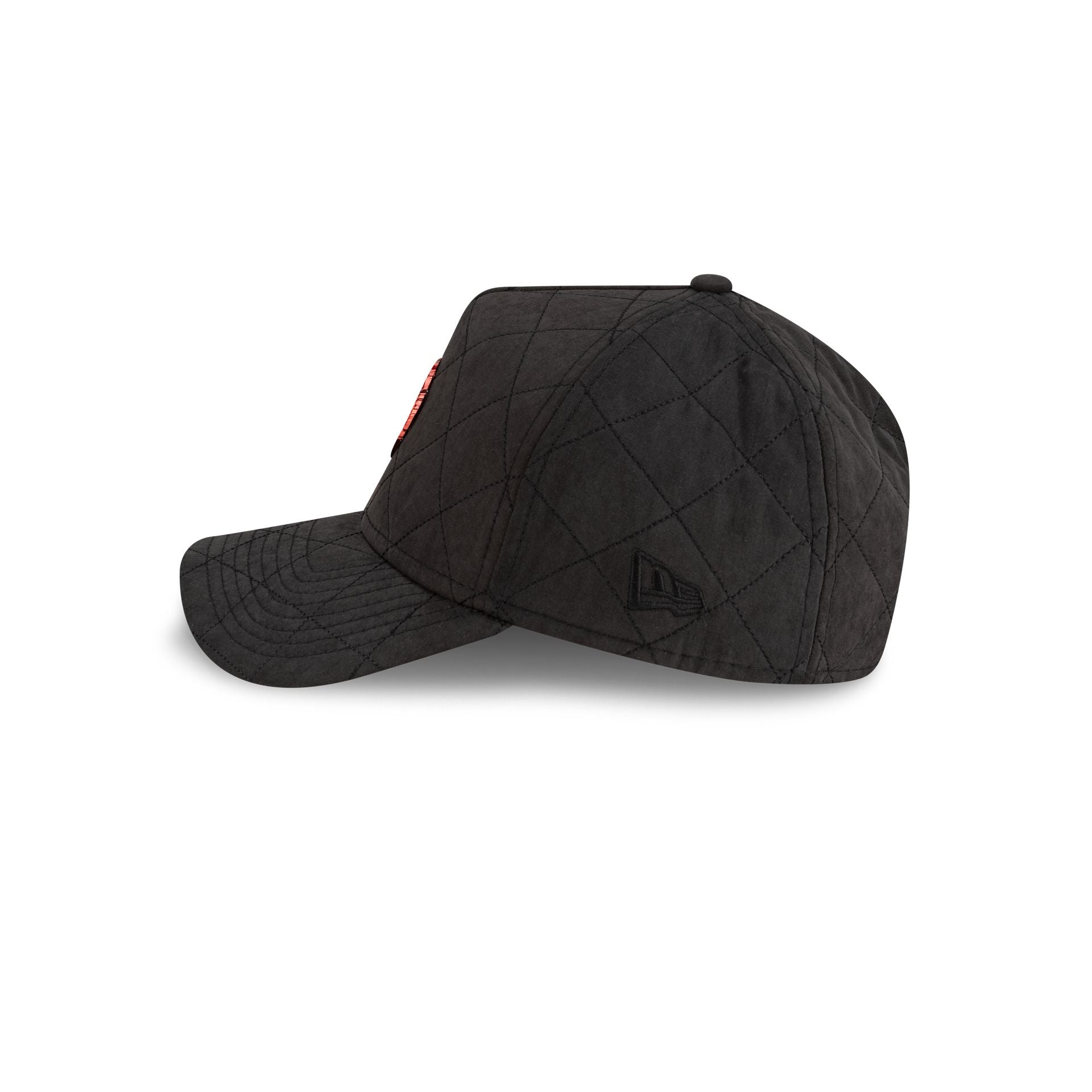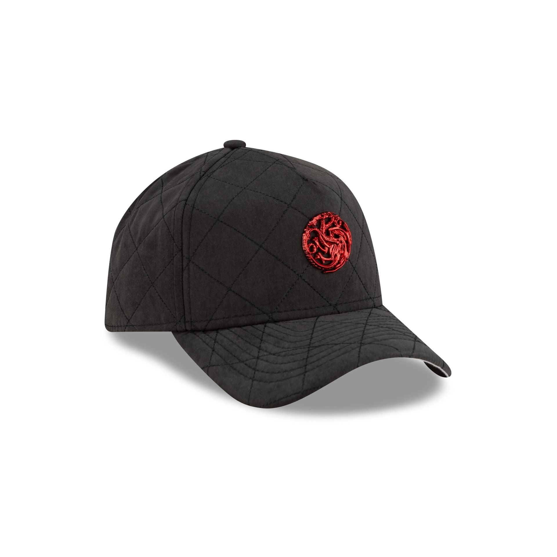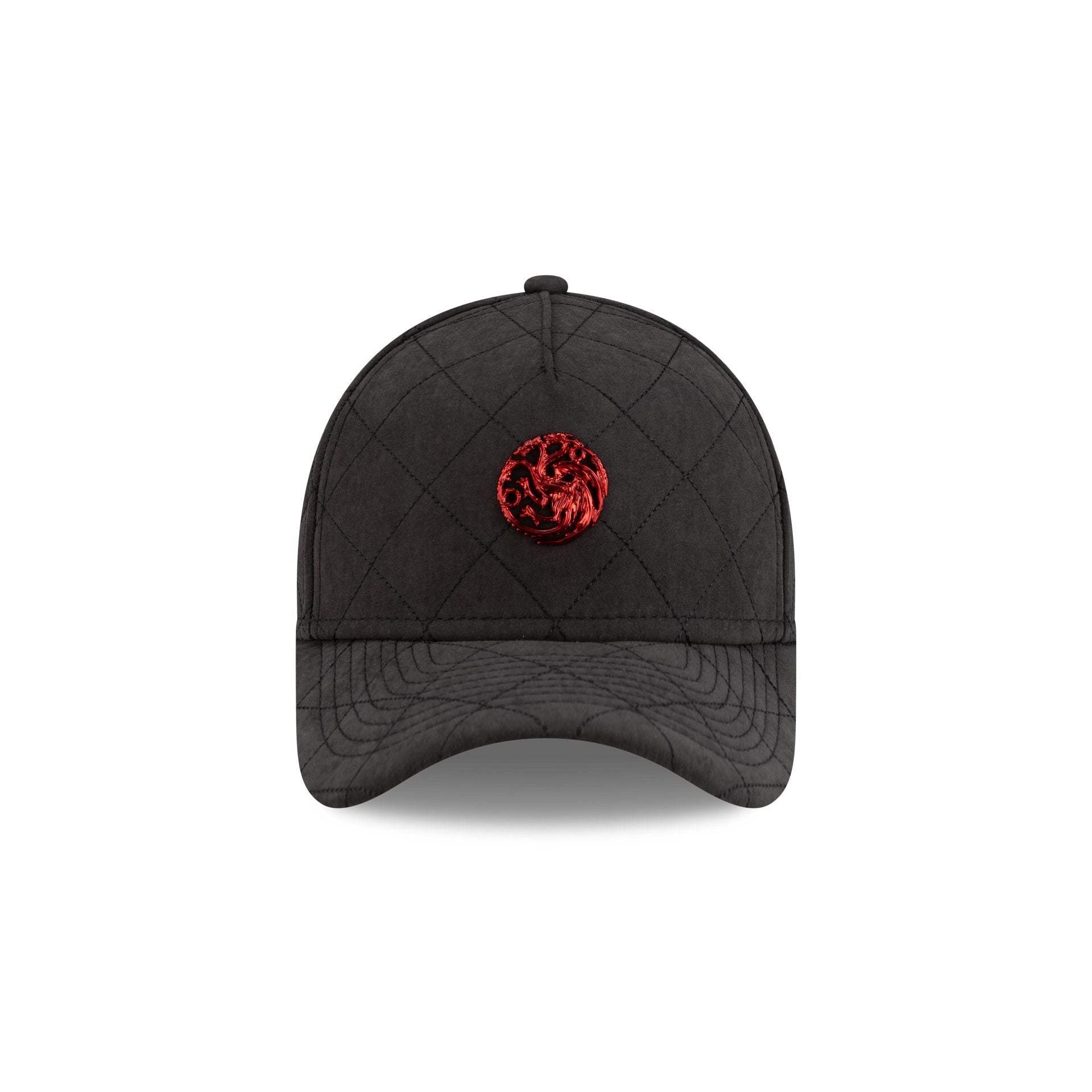 The Game of Thrones Targaryen 9FORTY A-Frame Snapback features a House of Targaryen brushed metallic red crest against a quilted nylon fabric throughout the cap. Additional details include an adjustable snapback closure with a gray undervisor.