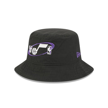 The Utah Jazz Nylon Logo Bucket Hat features an embroidered Jazz logo, establishment date, and NBA Logoman at the front.