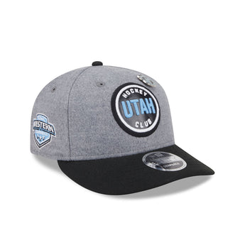 The Utah Mammoth Heather Gray Wool Low Profile 9FIFTY snapback features a faux leather applique Mammoth logo at the front panels against a wool fabrication throughout the cap. Additional details include a conference patch at the right-wear side, an NHL pin at the front, and a script wordmark above an adjustable snapback closure at the rear.